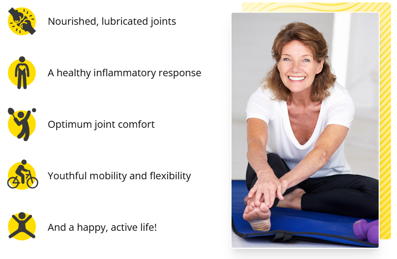 At the core of the formula is a patented hyaluronic acid complex (Mobilee®), which helps boost levels of hyaluronan, a natural compound in joint synovial fluid that keeps joints well-lubricated and cushioned.